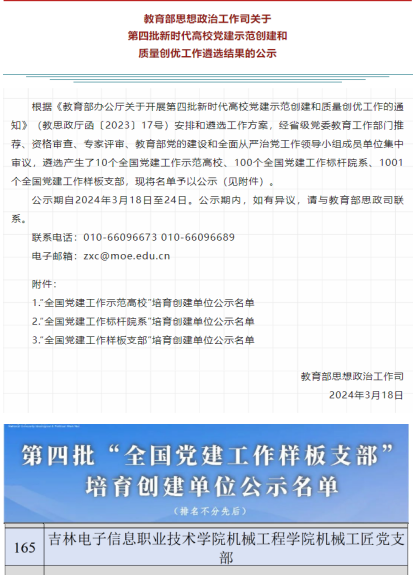 近日,教育部思想政治工作司对第四批“全国党建工作样板支部”培育创建单位进行了公示,我校机械工程学院机械工匠党支部入选第四批“全国党建工作样板支部”培育创建单位。